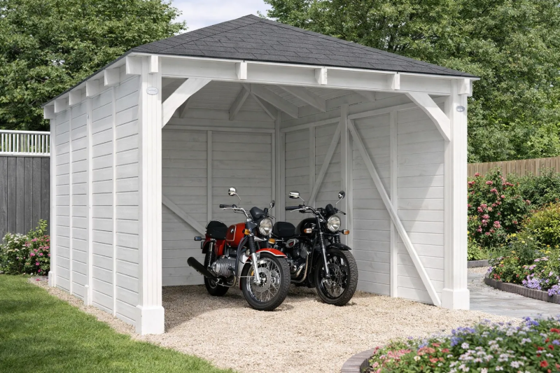Многие проекты навесов предусматривают наличие хозяйственного блока, где можно хранить запчасти, инвентарь, инструменты, дрова и т.п. Размеры и конфигурация сооружений колеблются в широких пределах, а накрываемая площадь составляет от 15 до 74 кв. м. Соответственно, диапазон цен также очень широк – от 200 до 2200 тыс. рублей.