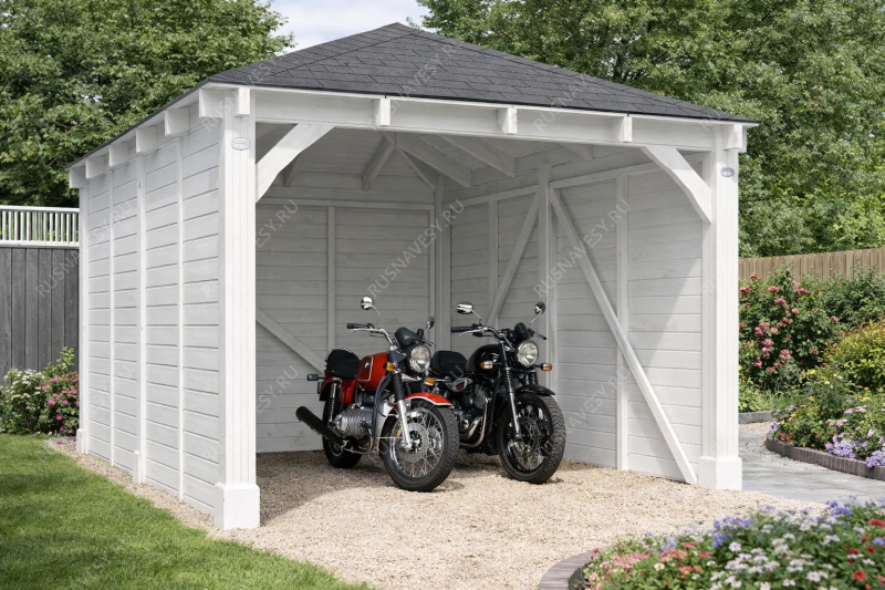 Участок возле собственного дома, дачи или любого другого частного домостроения не обходится без малых архитектурных форм. Удачным приобретением станет деревянный навес для мотоцикла. Компактная, но надёжная конструкция может быть выполнена как полностью автономным сооружением с классическими архитектурными формами, так и в виде пристройки к дому или хозяйственной постройке. Продуманное решение изящно впишется в планировку любого дачного или загородного участка, не загромождая пространство. Деревянный навес послужит отличным парковочным местом для одного или нескольких мотоциклов, освобождая полезное пространство в гараже или сарае. Для производства всех элементов используется только отборная древесина без малейших дефектов, прошедшая камерную сушку и глубокую пропитку антисептиками. Такому навесу не страшны высокая влажность и перепады температур - можно быть уверенным, что дерево не растрескается, не разбухнет и не покоробится даже спустя годы активной эксплуатации.